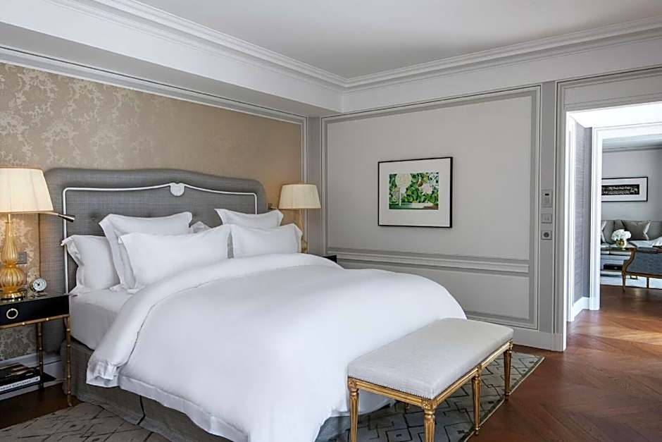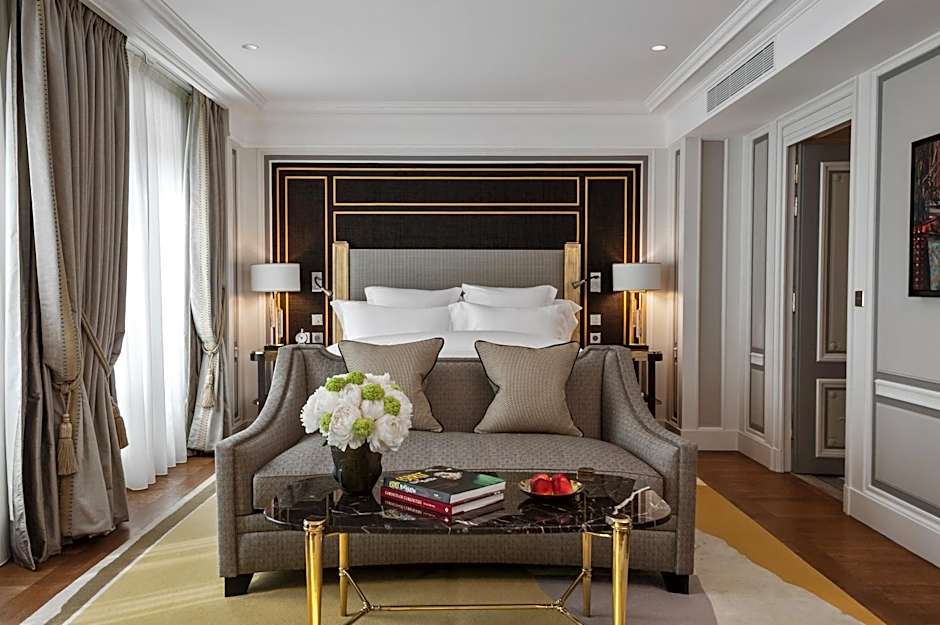 Designed in a quintessentially French style, this suite features a separate living room and a spacious bedroom. The large marble bathroom features underfloor heating as well as a bathroom mirror with an inset television. A walk-in rain shower and a bath are also provided. A Nespresso coffee machine, a selection of fine teas are at guests' disposal. A butler service and complimentary pressing of 3 garments per guest per day are available.