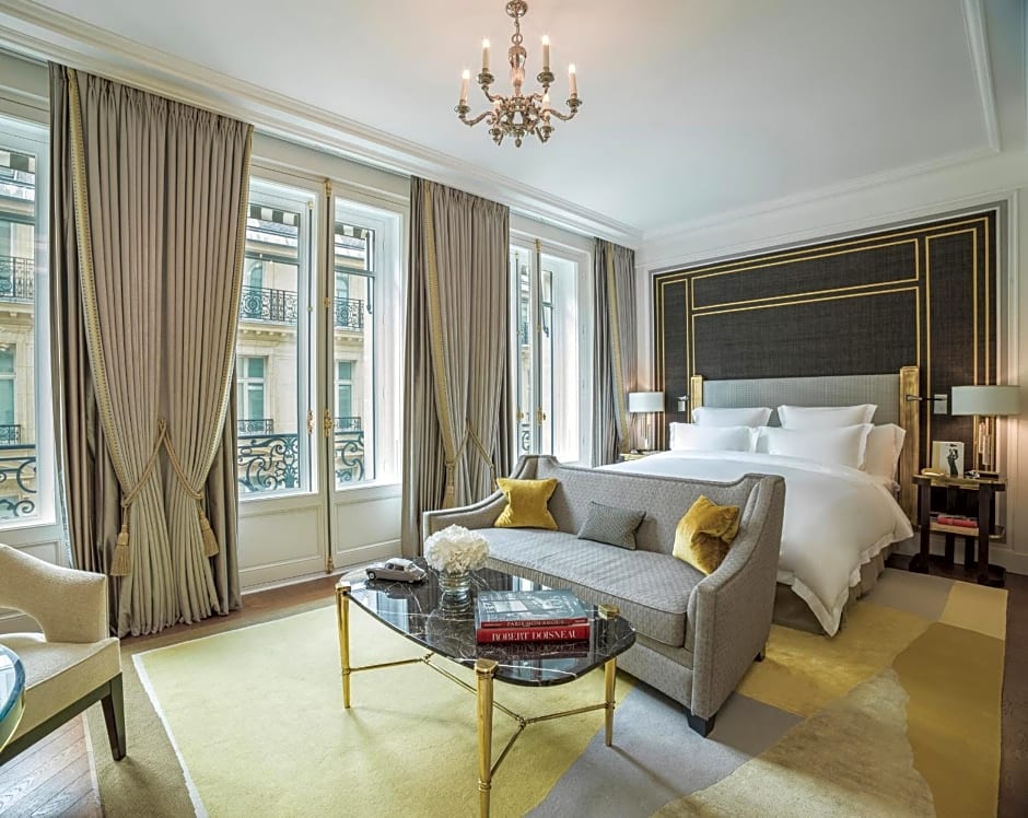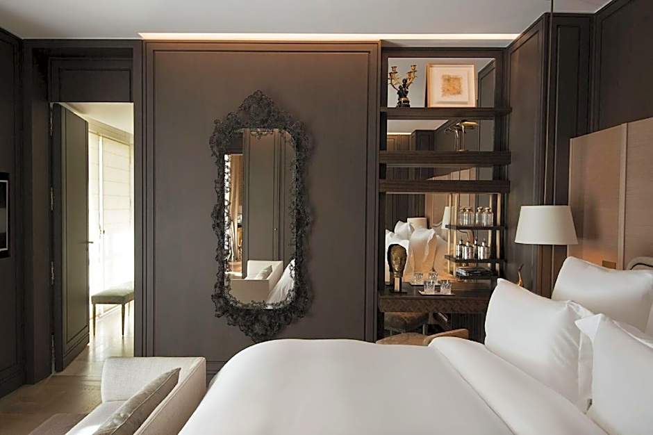 This room provides the charm of a modern Parisian residence with ample space. The large marble bathroom features underfloor heating as well as a bathroom mirror with an inset television. A walk-in rain shower and a bath are also provided. A Nespresso coffee machine and a selection of fine teas are at guests' disposal.